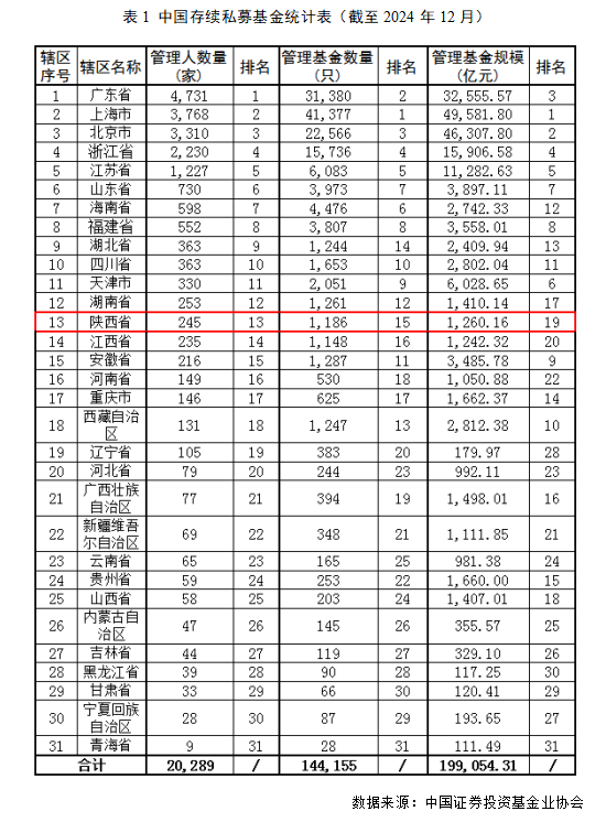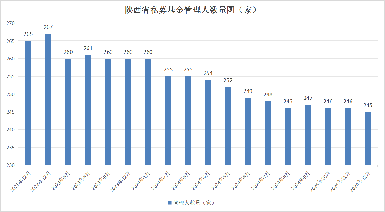截至2024年12月末,按照注册地口径统计,陕西省私募基金管理人245家,其中证券类管理人65家,股权类管理人179家,其他类管理人1家。