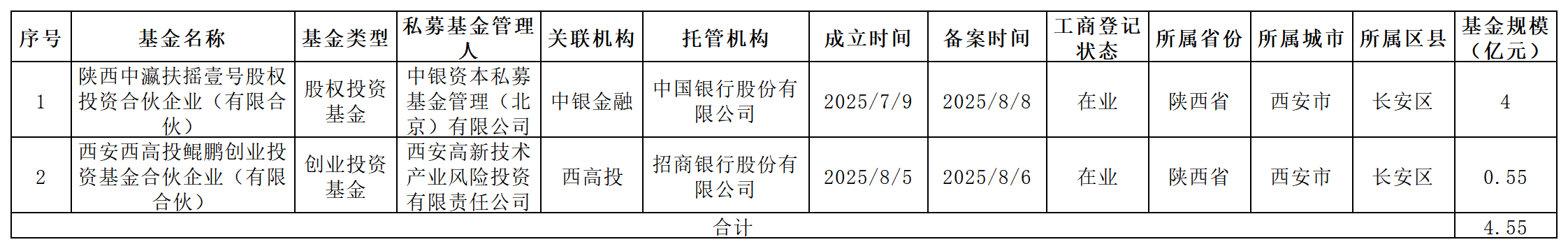 表2 陕西省新增股权、创业投资基金备案统计表(2025年8月)