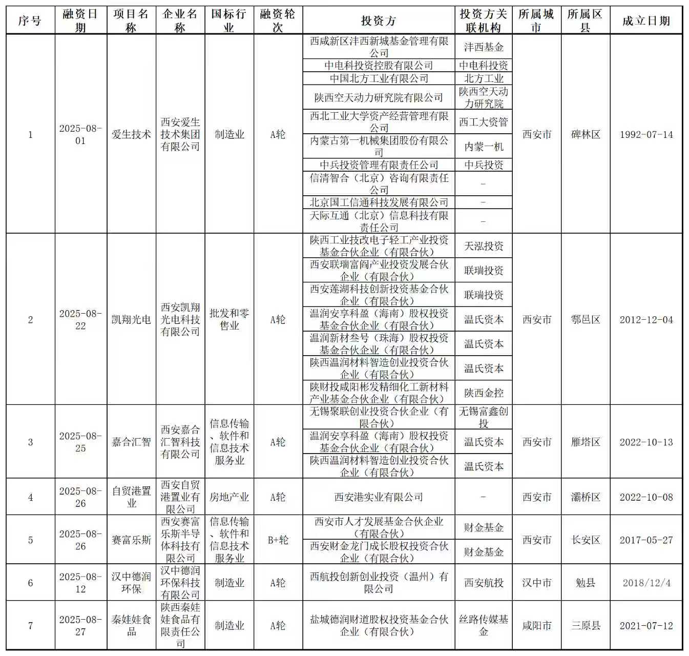 表3 陕西省2025年8月投融资事件