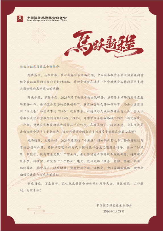 近日,陕西基金业协会收到来自中国基金业协会的感谢信,对协会过去一年的工作和双方的密切合作表示肯定,对秘书长哈立新作为监督员认真履行职责,及时反映行业声音诉求,积极传达解读行业监管理念政策,发挥外部监督作用表示感谢。