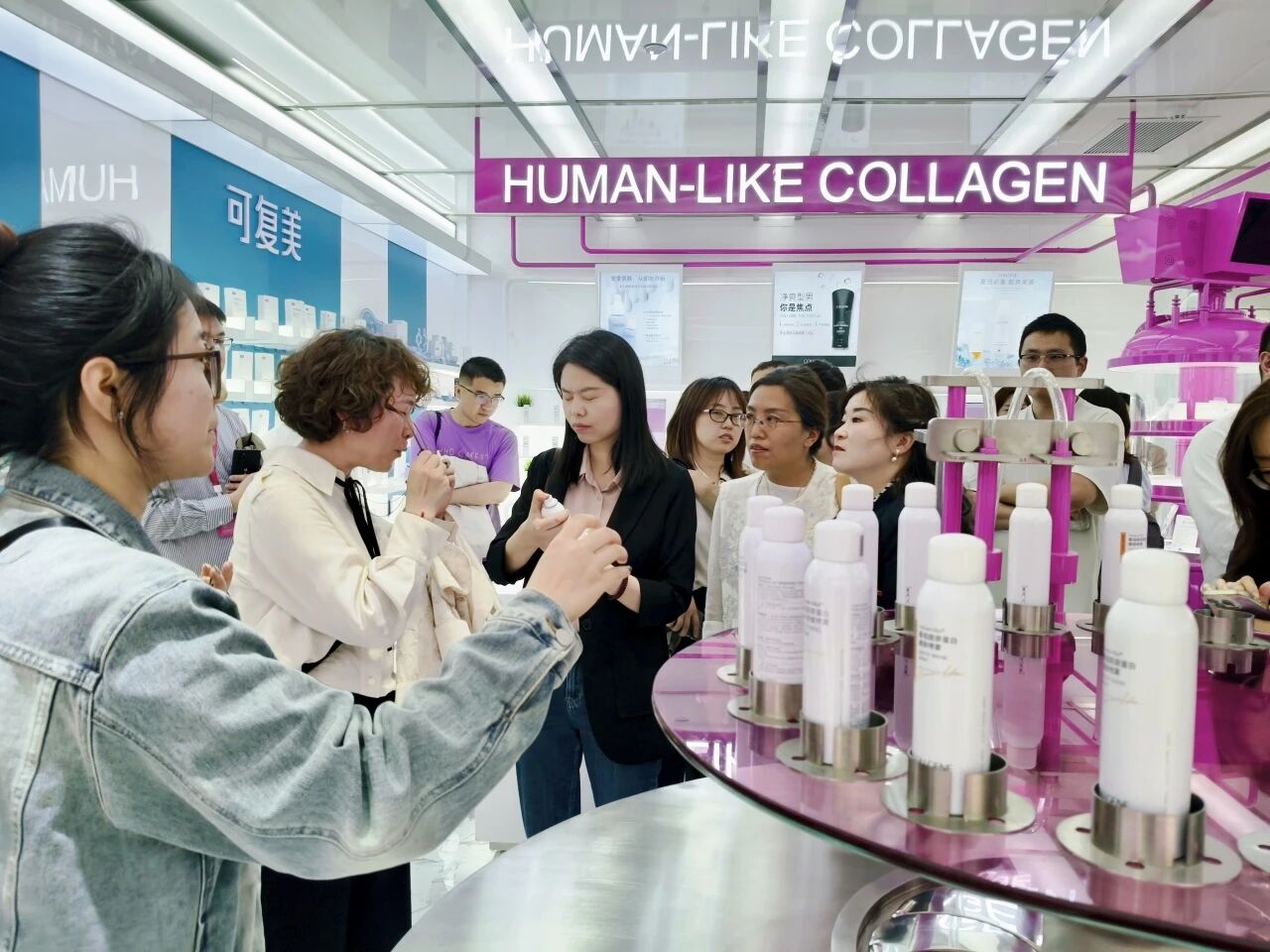 下午3时,调研团抵达巨子生物新工厂。在企业展厅,代表们详细了解了巨子生物自2000年成立以来的发展历程、合成生物学技术平台、核心专利成果以及“可复美”“可丽金”等六个核心品牌。