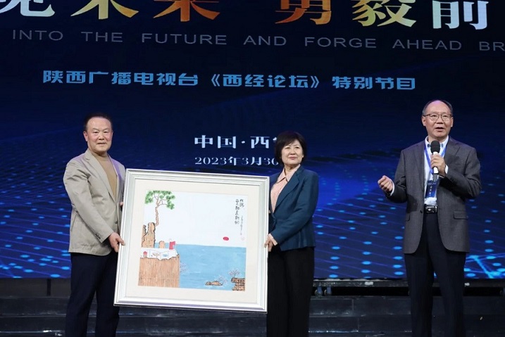 金融和艺术两个不同的行业在节目现场完美结合,哲理中国画创始人、教授、陕西开放大学党委书记王家春,为《西经论坛》节目组送上画作。