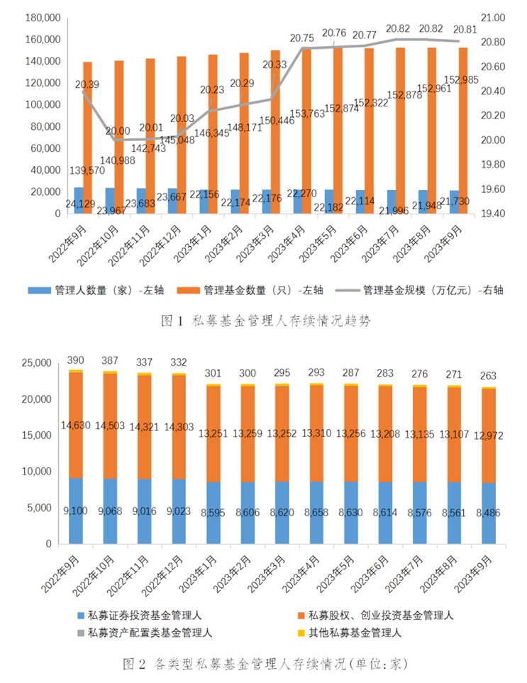 截至2023年9月末,存续私募基金管理人21,730家,管理基金数量篇[1]152,985只,管理基金规模[2]20.81万亿元。其中,私募证券投资基金管理人8,486家,私募股权、创业投资基金管理人12,972家,私募资产配置类基金管理人9家;其他私募投资基金管理人263家。