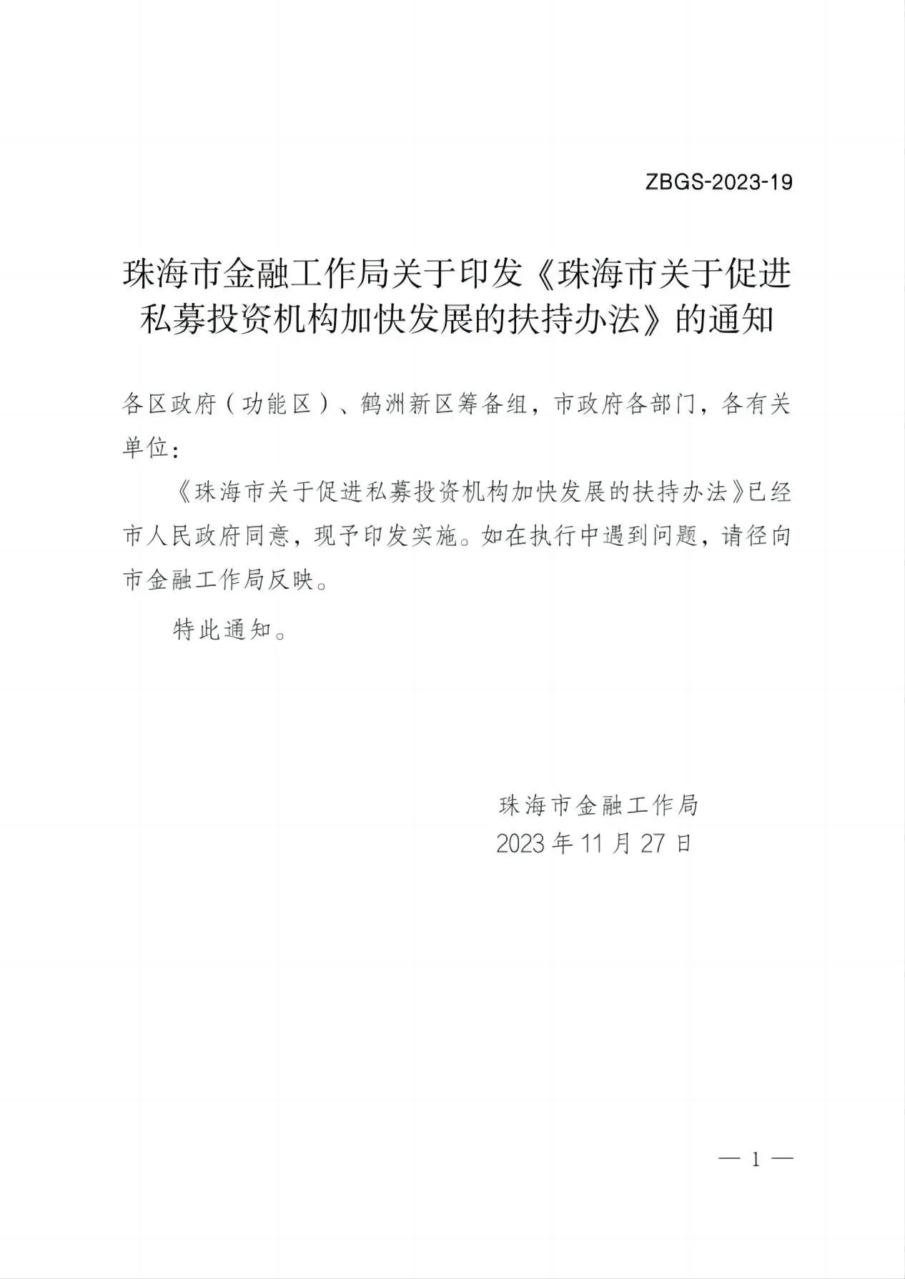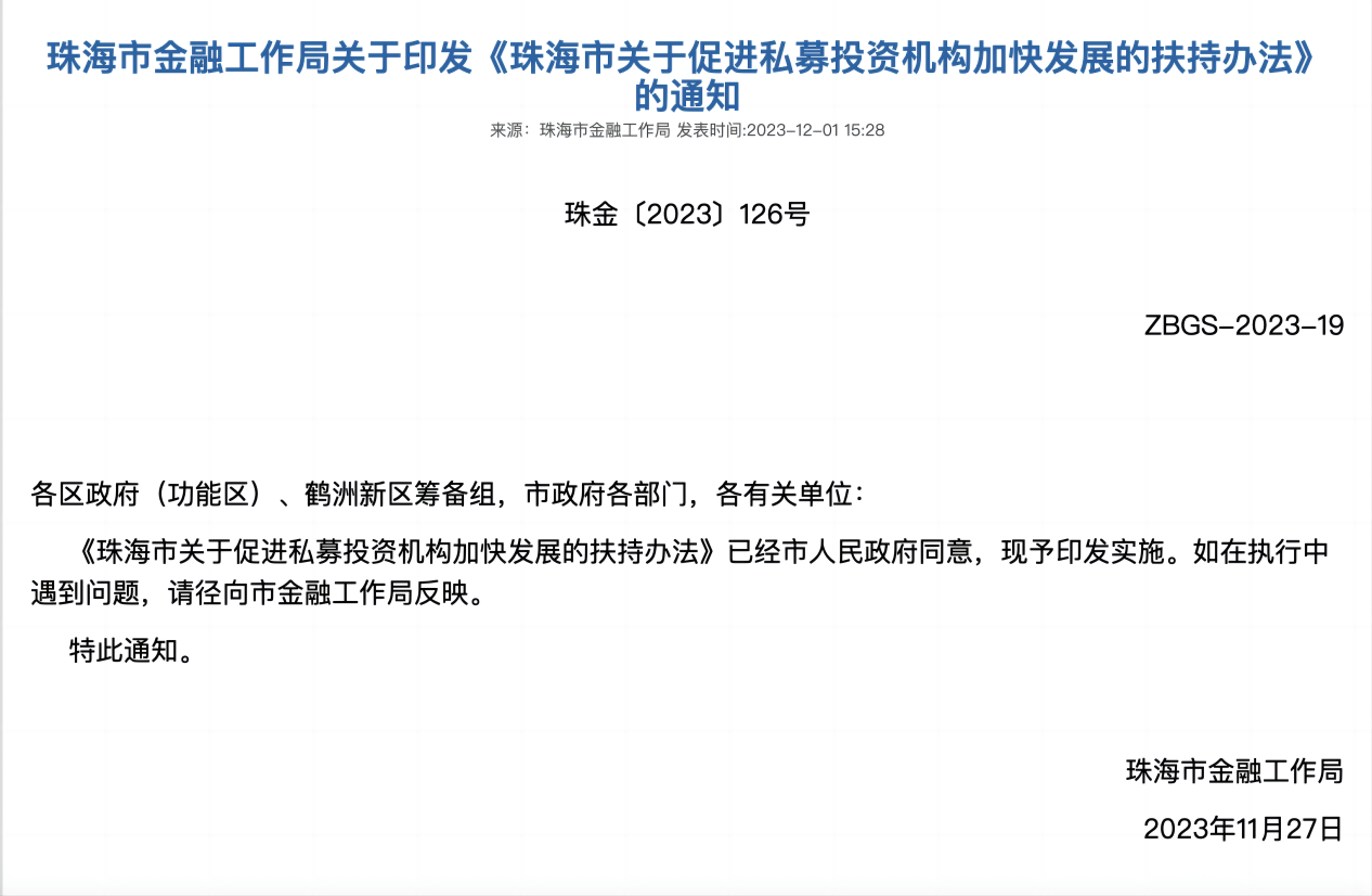 2023年12月1日,珠海市金融工作局发布《关于印发<珠海市关于促进私募投资机构加快发展的扶持办法>的通知》(珠金(2023)126号),公布了通过后的《珠海市关于促进私募投资机构加快发展的扶持办法》(以下简称“《扶持办法》”),明确指出加快推进珠海私募投资机构的集聚,支持私募投资业务创新发展,优化私募投资营商环境,打造具有创新能力和国际化水平的粤港澳大湾区创投高地,服务珠海经济实现高质量发展。