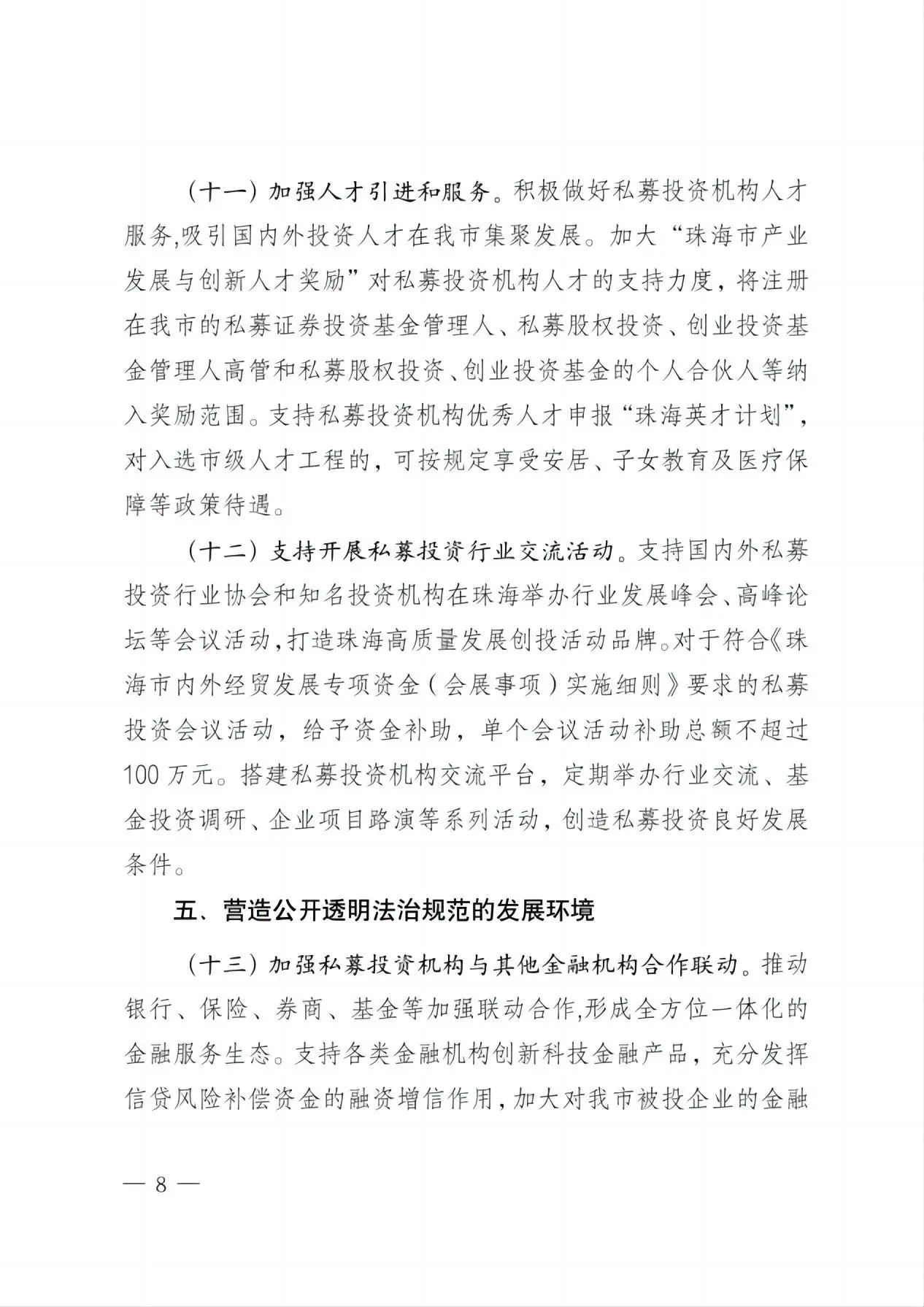 积极做好私募投资机构人才服务,吸引国内外投资人才在我市集聚发展。加大“珠海市产业发展与创新人才奖励”对私募投资机构人才的支持力度,将注册在我市的私募证券投资基金管理人、私募股权投资、创业投资基金管理人高管和私募股权投资、创业投资基金的个人合伙人等纳入奖励范围。支持私募投资机构优秀人才申报“珠海英才计划”,对入选市级人才工程的,可按规定享受安居、子女教育及医疗保障等政策待遇。 |