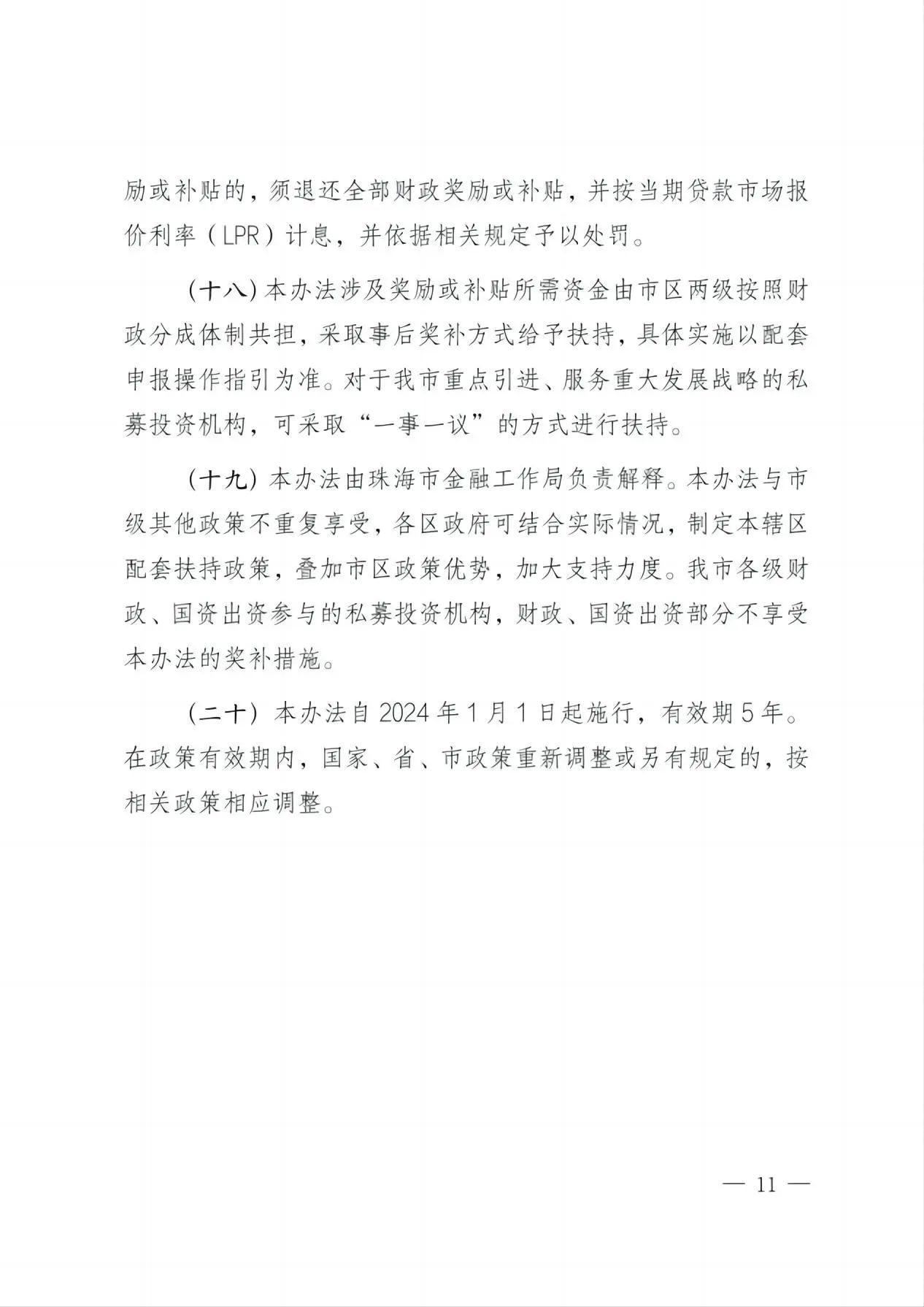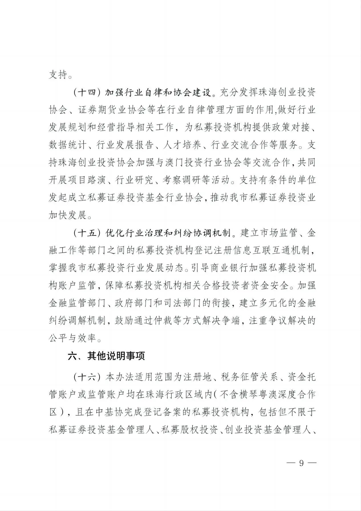 (十六)本办法适用范围为注册地、税务征管关系、资金托管账户或监管账户均在珠海行政区域内(不含横琴粤澳深度合作区),且在中基协完成登记备案的私募投资机构,包括但不限于私募证券投资基金管理人、私募股权投资、创业投资基金管理人、私募证券投资基金、私募股权投资、创业投资基金等。 |