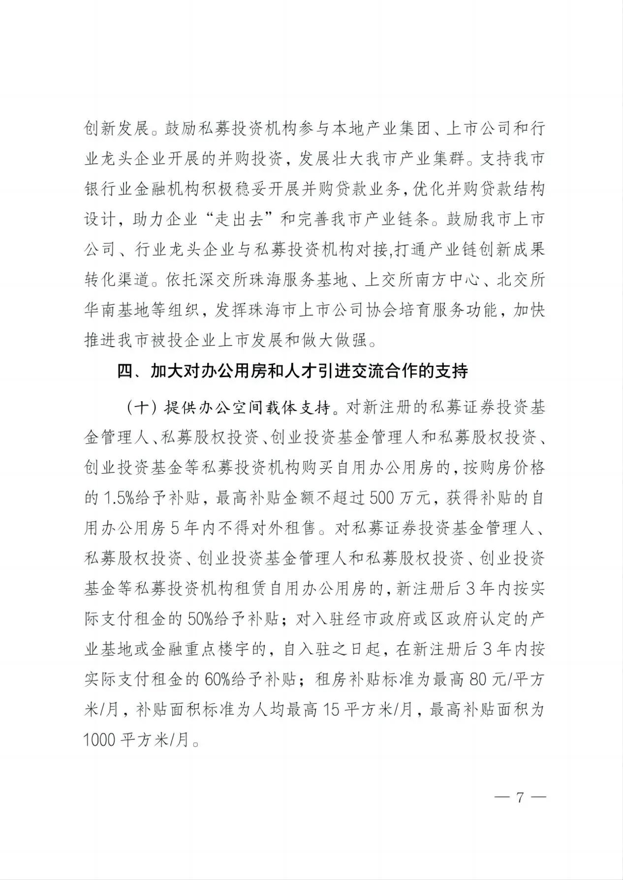 第十三条 对在横琴新区租赁自用办公用房且实际办公的私募基金管理人,连续3年给予房租补贴,补贴标准为房租单价的30%,最高不超过80元/平方米,最高补贴面积不超过1000平方米。 |