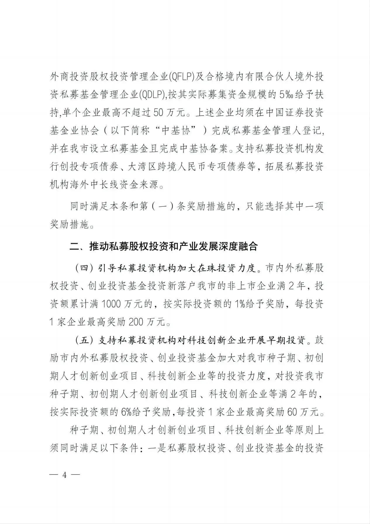 1.对新注册(含新设立或新迁入,下同)且实际规模达1亿元(含本数,人民币或等值外币,下同)的私募证券投资基金管理人,按其规模0.5‰给予奖励,最高不超过500万元。对新注册且实际规模达1亿元、以量化交易为主的私募证券投资基金管理人,按其规模0.8‰给予奖励,最高不超过500万元。 “实际规模”是指私募证券投资基金管理人及其管理的基金在我市证券经营机构新开立的交易端账户资产规模,包括各类保证金余额、股票市值、金融产品市值等。 2.对新注册的公司制私募股权投资、创业投资基金给予奖励:实收资本5000万元以上的,给予20万元奖励;实收资本1亿元以上的,给予50万元奖励;实收资本达到3亿元以上的,给予100万元奖励。 3.对新注册的合伙制私募股权投资、创业投资基金给予奖励:实缴出资2亿元以上的,给予20万元奖励;实缴出资5亿元以上的,给予50万元奖励;实缴出资10亿元以上的,给予100万元奖励。 |