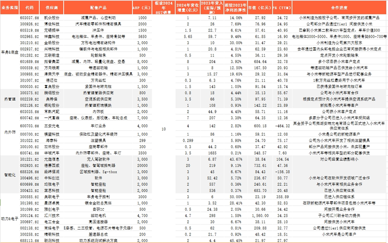 除小米集团外,小米汽车大卖的话也会为其供应链带来较大的成长机会,我们将研究的供应商情况罗列成了以下表格供大家交流探讨。