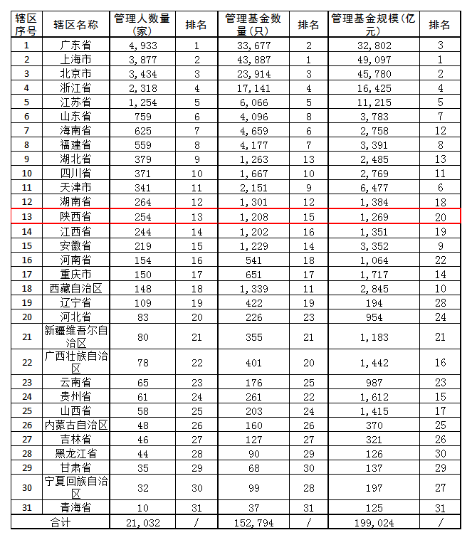 根据基金管理人注册地口径统计,陕西省管理私募基金数量1208只,比上年同期增加了79只,在全国占比0.79%,全国排名第15位。