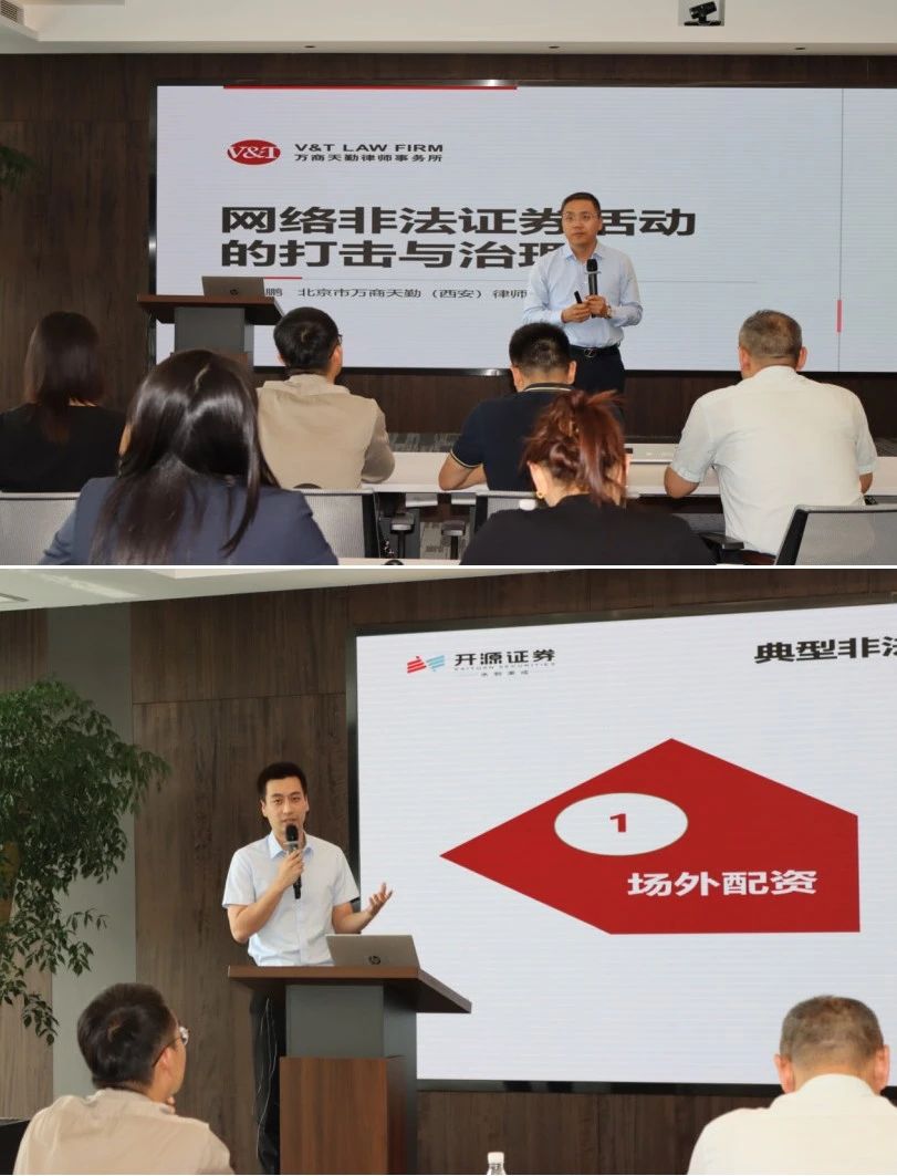 专题讲座环节,西安仲裁委仲裁员、北京市万商天勤(西安)律师事务所执行主任卫永鹏与大家分享了《网络非法证券活动的打击与治理》主题报告,通过以案说法,从网络非法证券活动的法律规范、违法表现、违法认定、打击与治理等多个方面对网络非法证券活动及其治理进行了全方位的介绍。开源证券投教基地投教专员杨乐通过生动鲜活的案例深入浅出的为大家介绍非法证券期货活动的常见形式、典型特征和防范措施。
