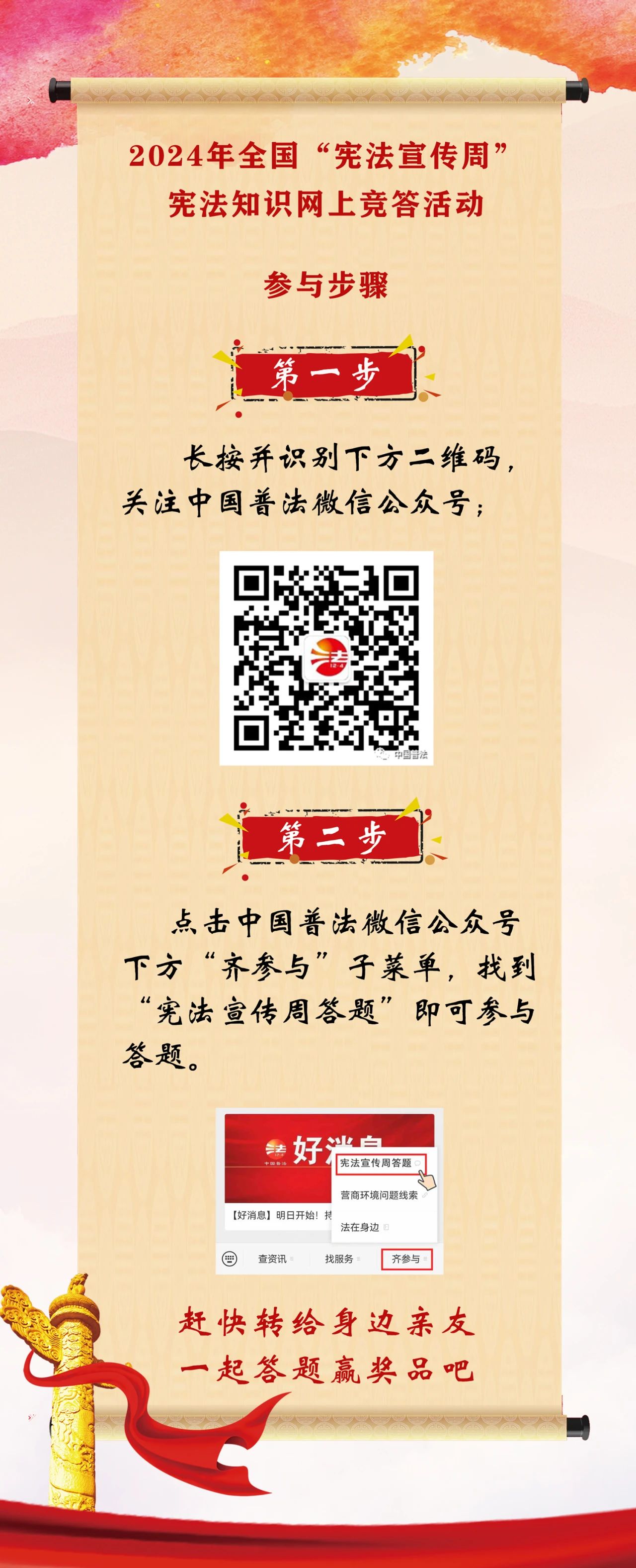 今年是中华人民共和国成立75周年,12月4日是第十一个国家宪法日。中国普法微信公众号从12月1日起,举办2024年全国“宪法宣传周”宪法知识网上竞答活动,至12月30日结束,共计30天。