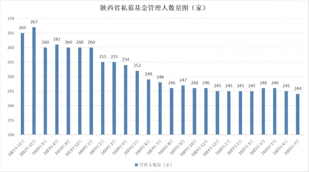 截至2025年7月末,按照注册地口径统计,陕西省私募基金管理机构246家,总管理基金数量1213只,管理基金规模1274.5亿元。