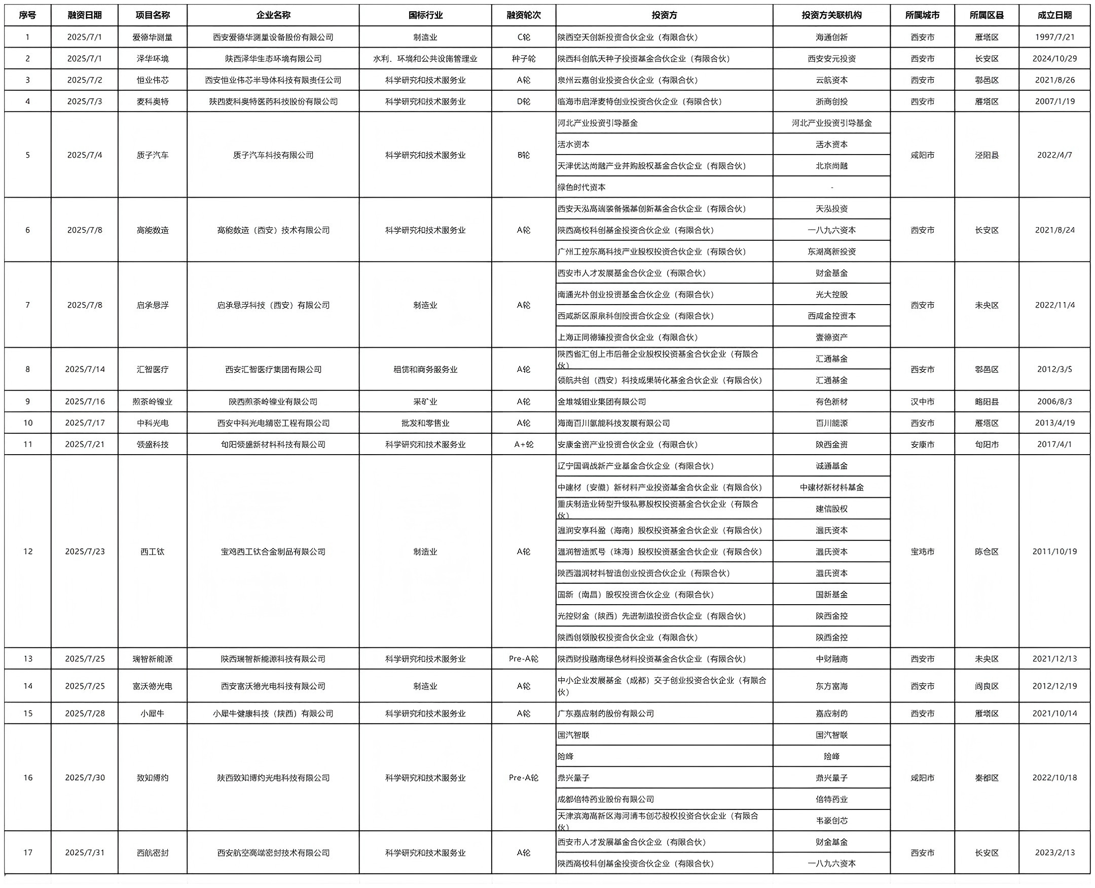 表3 陕西省2025年7月投融资事件