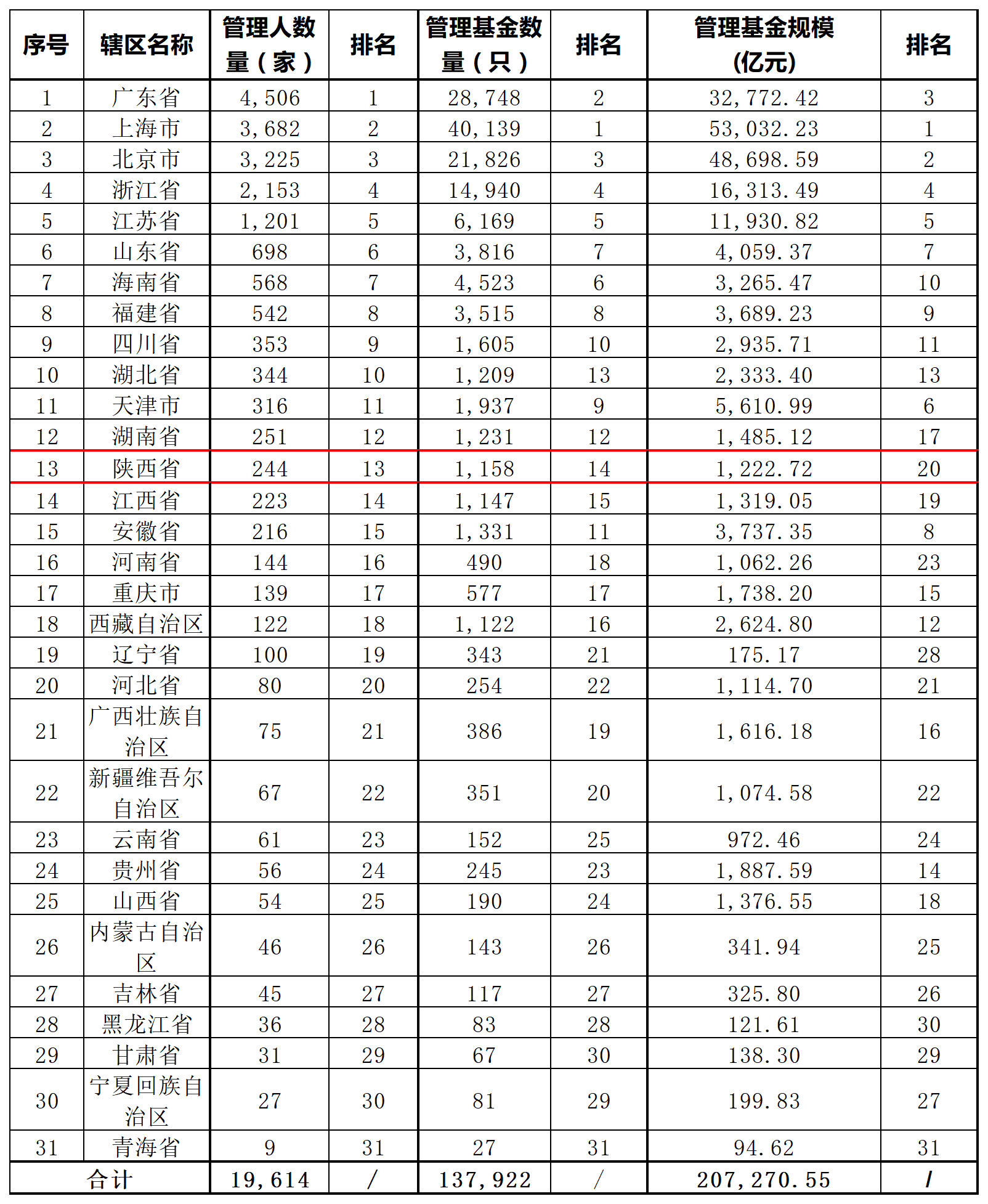陕西省私募基金管理数量1195只,比年初减少了27只。在全国占比0.87%,全国排名第14位。