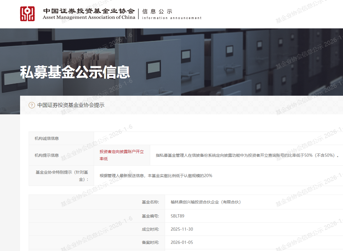 1月5日,榆林鼎创兴榆投资合伙企业(有限合伙) 在中国证券投资基金业协会成功完成备案(基金编号:SBLT89)。该基金总规模1亿元,由协会会员单位延安市鼎源私募基金管理有限公司担任基金管理人,上海、海南及陕西等地投资人共同出资组建。该基金将重点围绕延安与榆林两地主导产业开展投资,为延榆一体化发展注入强劲基金动力。