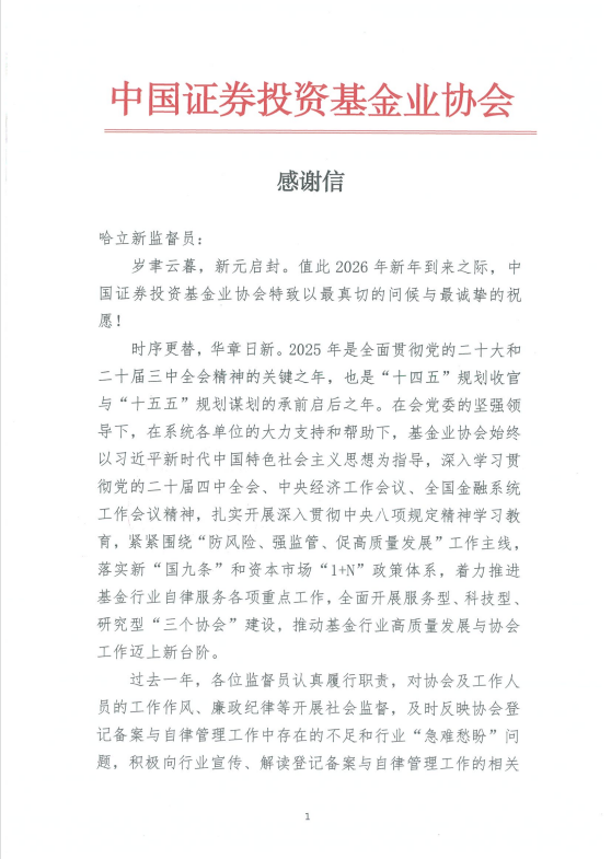 近日,陕西基金业协会收到来自中国基金业协会的感谢信,对协会过去一年的工作和双方的密切合作表示肯定,对秘书长哈立新作为监督员认真履行职责,及时反映行业声音诉求,积极传达解读行业监管理念政策,发挥外部监督作用表示感谢。