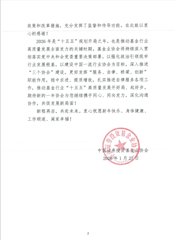 协会对于中国基金业协会的认可表示由衷地感谢。新的一年,协会将持续提升专业服务水平,积极支持中国基金业协会的工作,为基金行业和资本市场高质量发展提供持续助力。