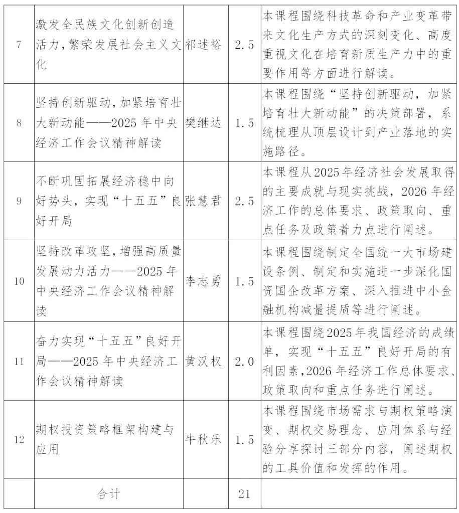 按照2026年度基金从业人员后续培训工作计划,为进一步加强行业党建引领,厚植行业文化理念,提升合规意识,增强专业投资能力,中国证券投资基金业协会(以下简称协会)持续丰富培训内容。2026年1月-2月基金从业人员远程培训系统(https://peixun.amac.org.cn/)新上线课程12门21课时,主要为党建引领与专业技能培训课程,包括学习贯彻党的二十届四中全会和2025年中央经济工作会议精神解读系列课程、期权投资策略框架构建与应用等(见附件)。
